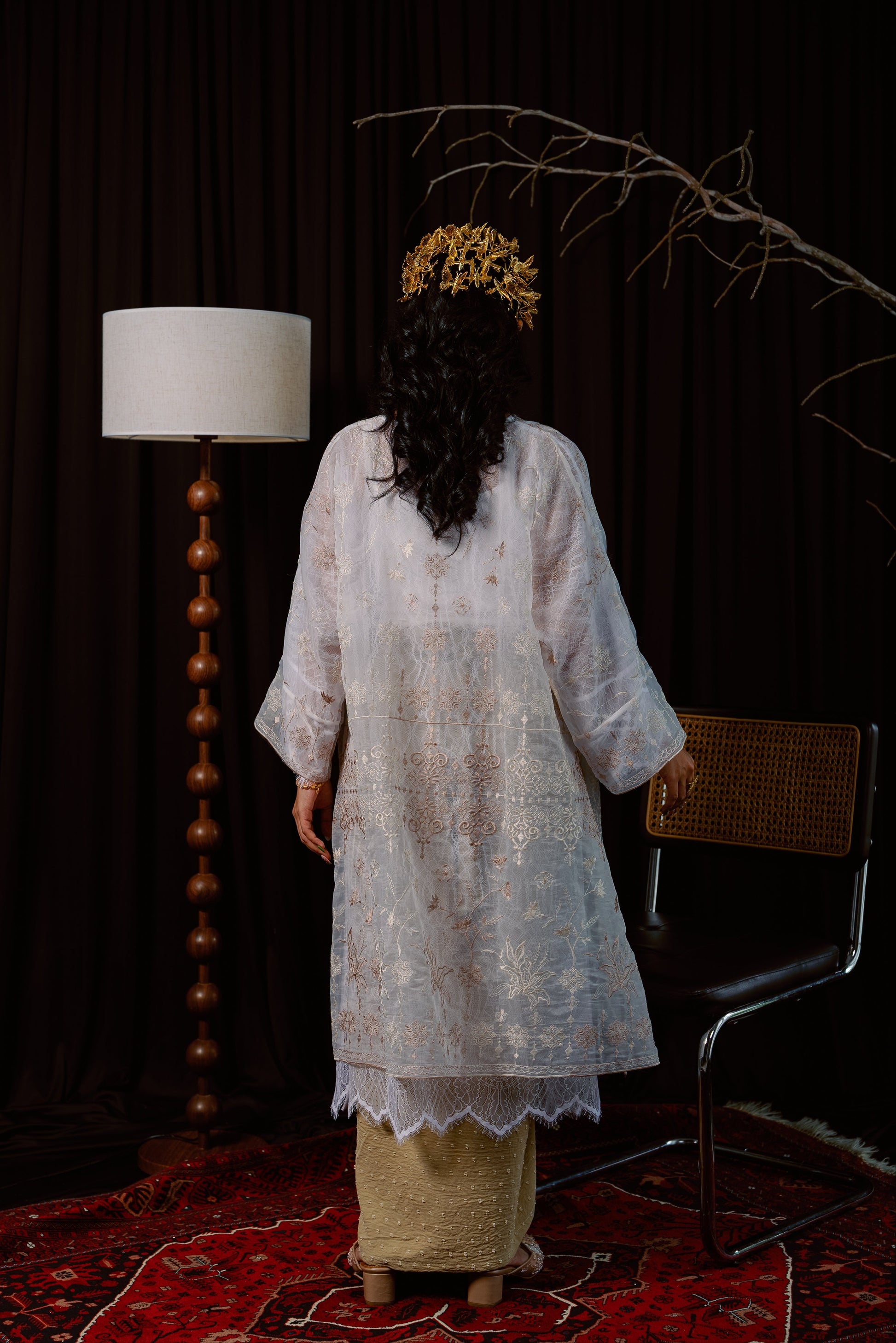 This double-layered kurung top features a soft premium fully embroidered milky organza as the first layer. Beneath it, a second layer of premium lace adds texture and depth, enhancing its luxurious feel.