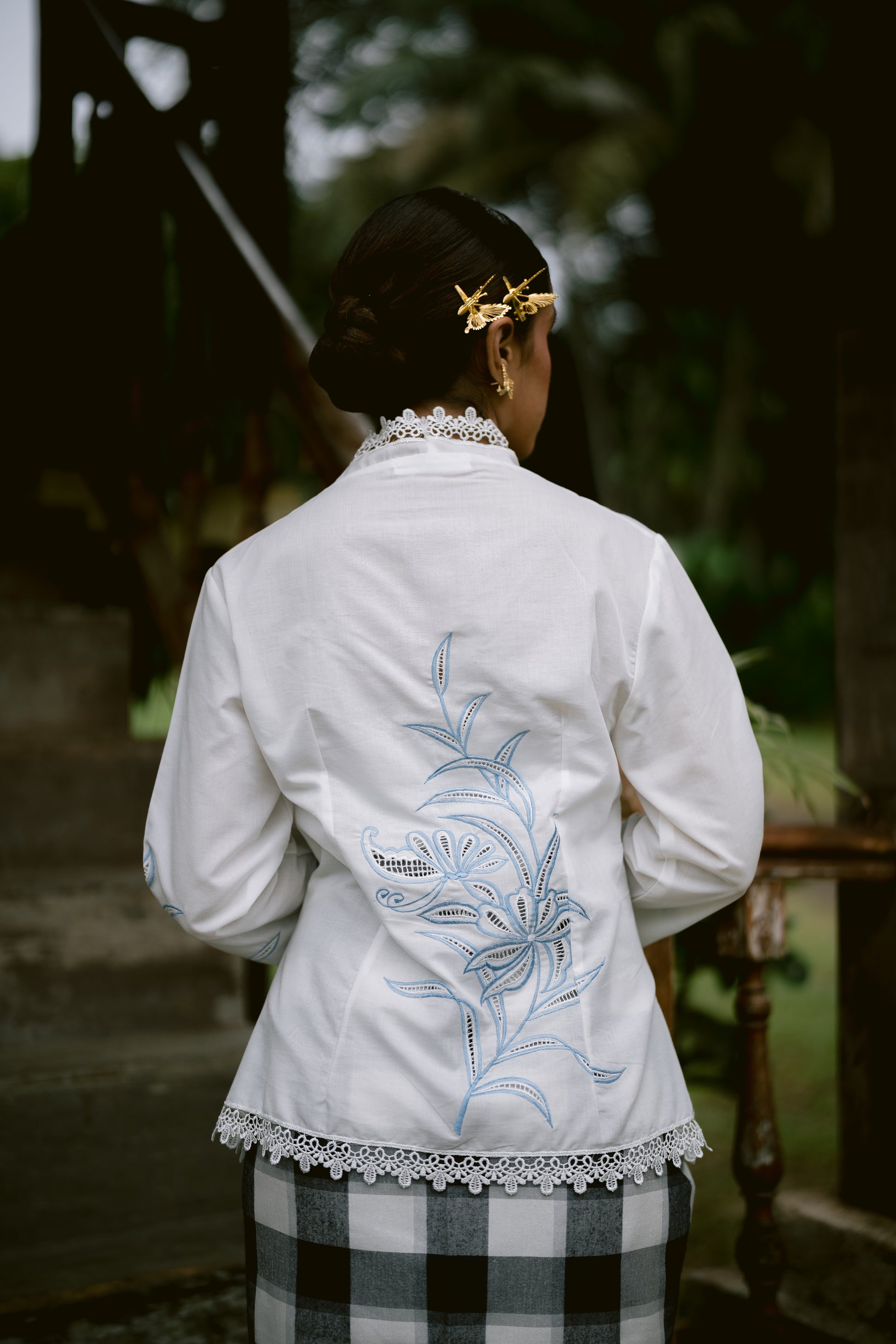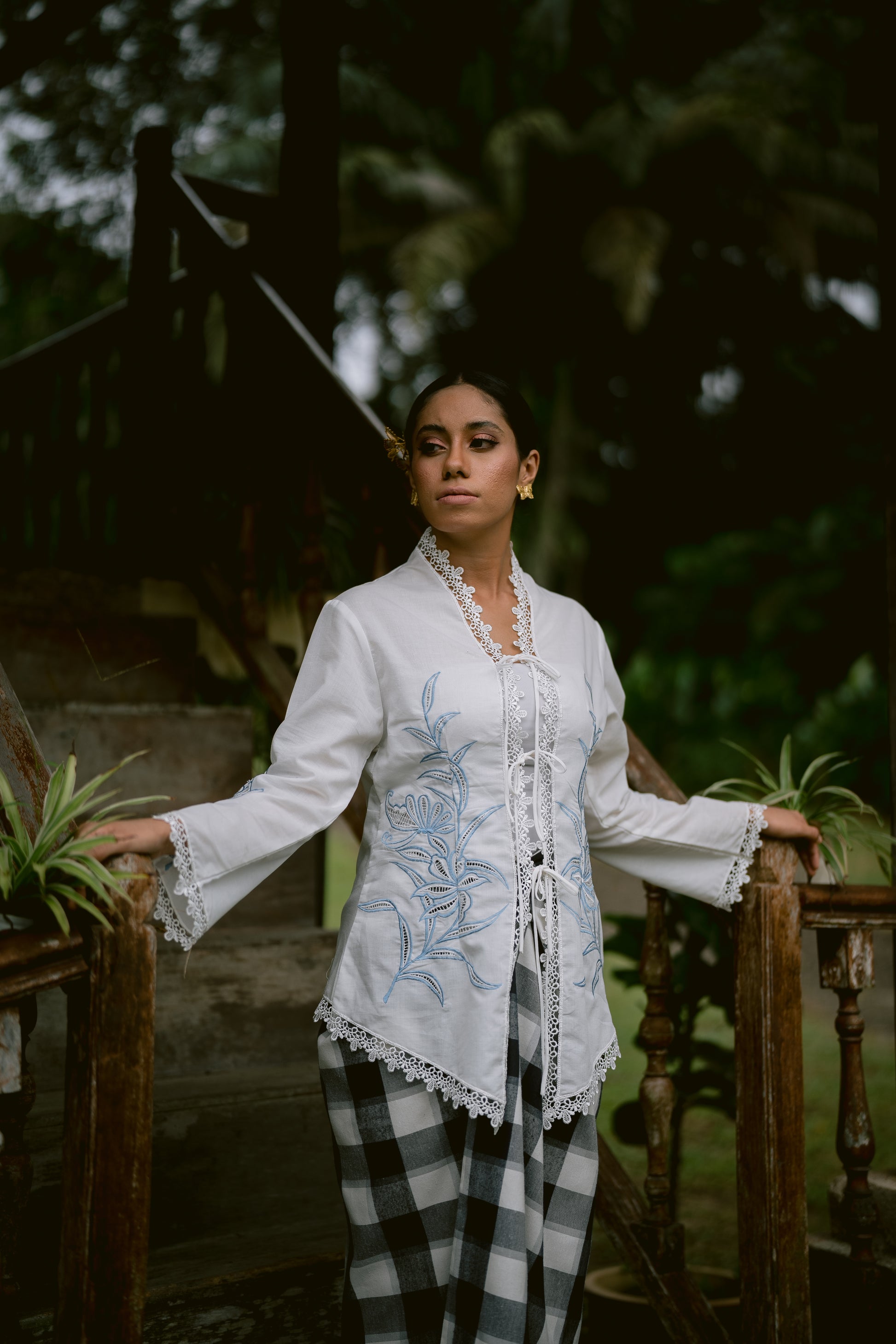 Rerama Hand Embroidered Kebaya Top in White & Blue
