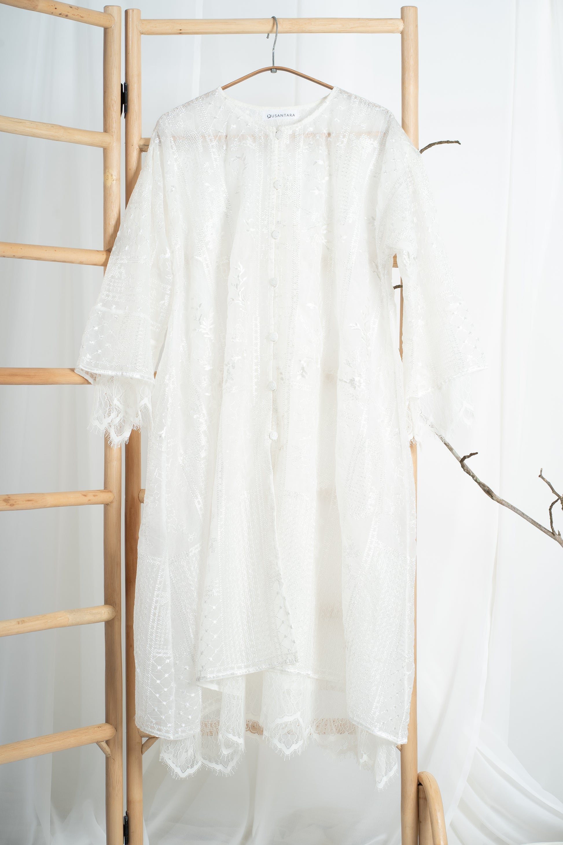 This double-layered kurung top features a soft premium fully embroidered milky organza as the first layer. Beneath it, a second layer of premium lace adds texture and depth, enhancing its luxurious feel.